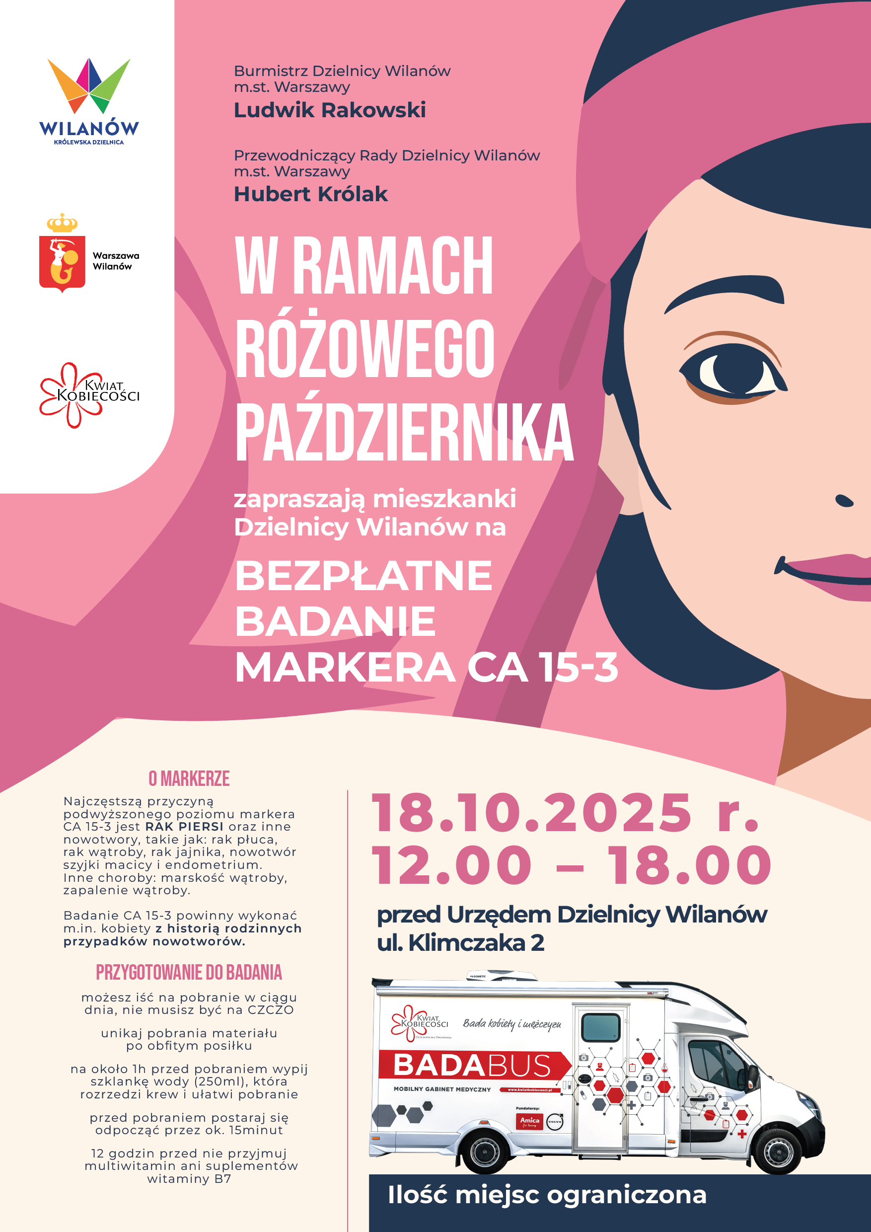 Burmistrz Dzielnicy Wilanów m.st. Warszawy Ludwik Rakowski oraz Przewodniczący Rady Dzielnicy Wilanów Hubert Królak zapraszają mieszkanki naszej dzielnicy do udziału w wyjątkowej akcji profilaktycznej organizowanej w ramach Różowego Października.
