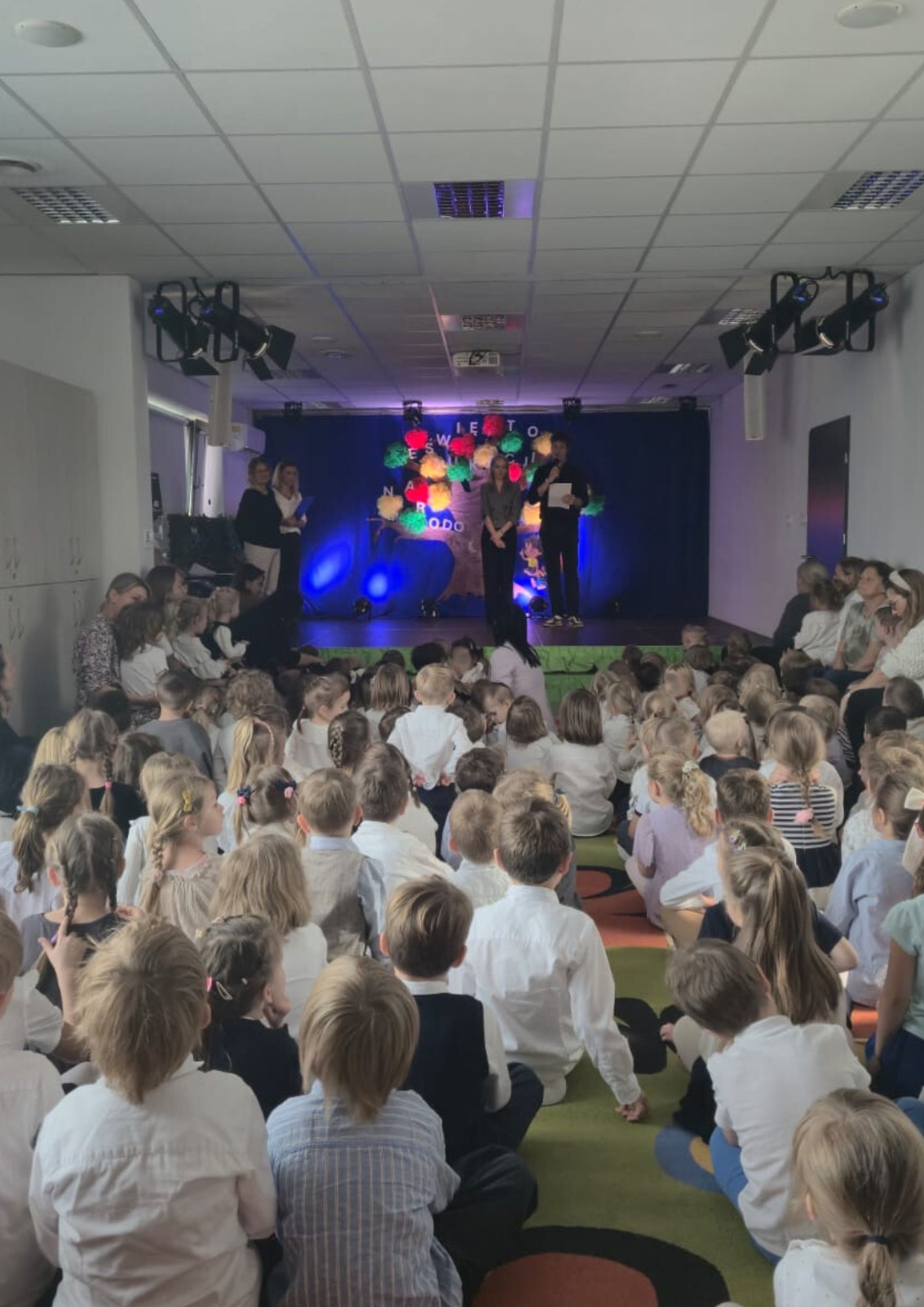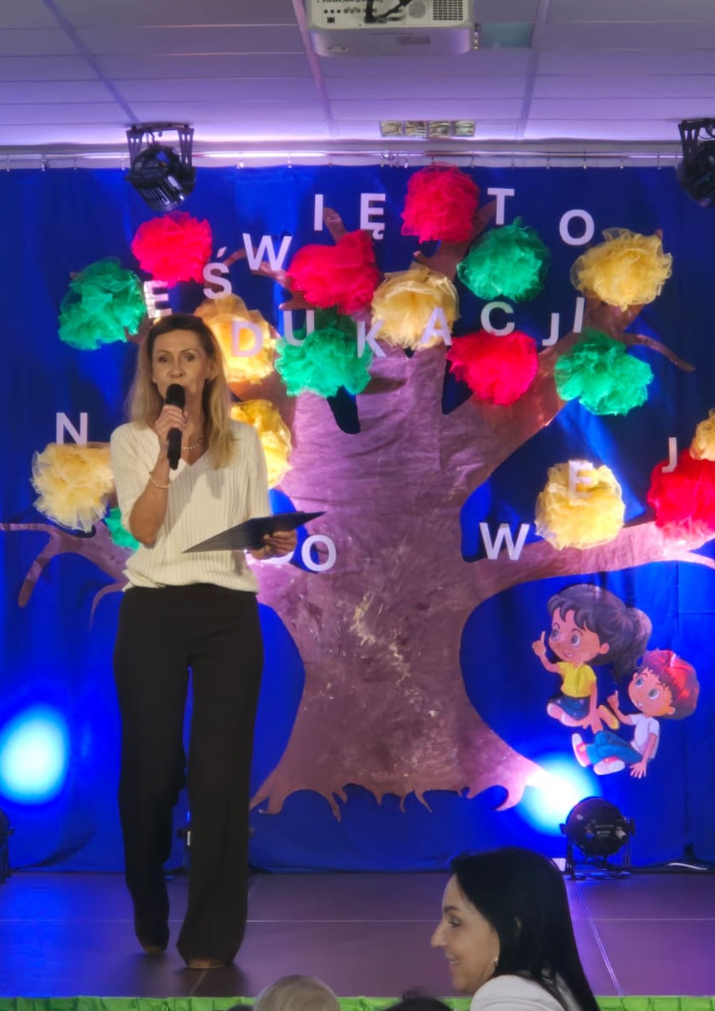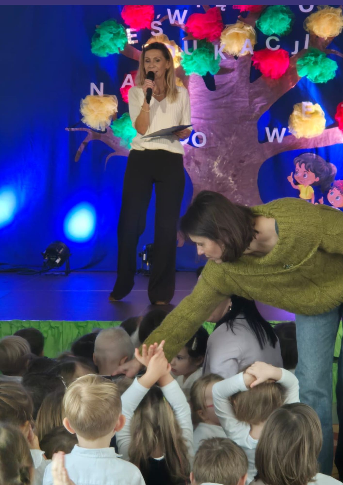 14.10.2025 r. był bardzo miłym dniem dla wszystkich pracowników przedszkola. Dzieci z wszystkich grup, nauczycielki oraz wszyscy pracownicy spotkali się na wspólnej uroczystości. Pani Basia M. prowadząca uroczystość powitała wszystkich zgromadzonych ora delegację Rady Rodziców. Następnie głos zabrała Pani Dyrektor Dorota K. i złożyła życzenia nauczycielom i pracownikom przedszkola. Po wystąpieniu Pani Dyrektor dzieci zaśpiewały Hymn przedszkola, po czym na scenę zaproszona została delegacja rodziców, której przedstawiciele przekazali życzenia dla wszystkich pracowników naszego przedszkola. Pani Basia i Pani Ada zaprosiły dzieci do udziału w mini wywiadzie. Dzieci odpowiadały na pytania: kto daje im uśmiech, co najbardziej lubią robić ze swoją panią, kto w przedszkolu najbardziej pilnuje porządku, kto dba, by w brzuszku nigdy nie było pusto i gotuje pyszne potrawy. Po wypowiedziach dzieci, Pani Dyrektor zaprosiła na scenę osoby nagrodzone i wyróżnione za pracę w ubiegłym roku szkolnym i wręczała nagrody. Uroczyste spotkanie sprawiło wszystkim ogromną radość i było miłą niespodzianką w tym dniu.