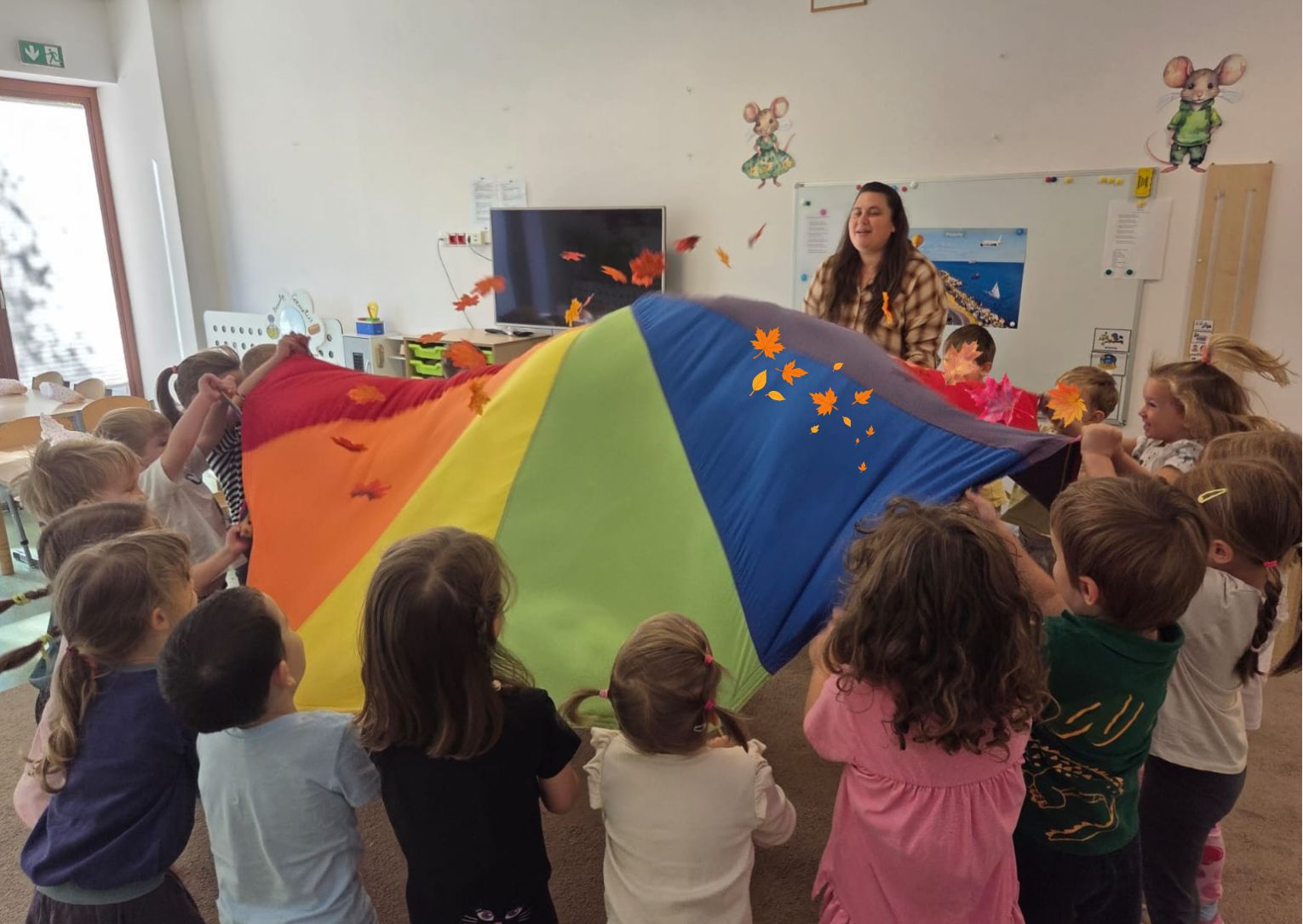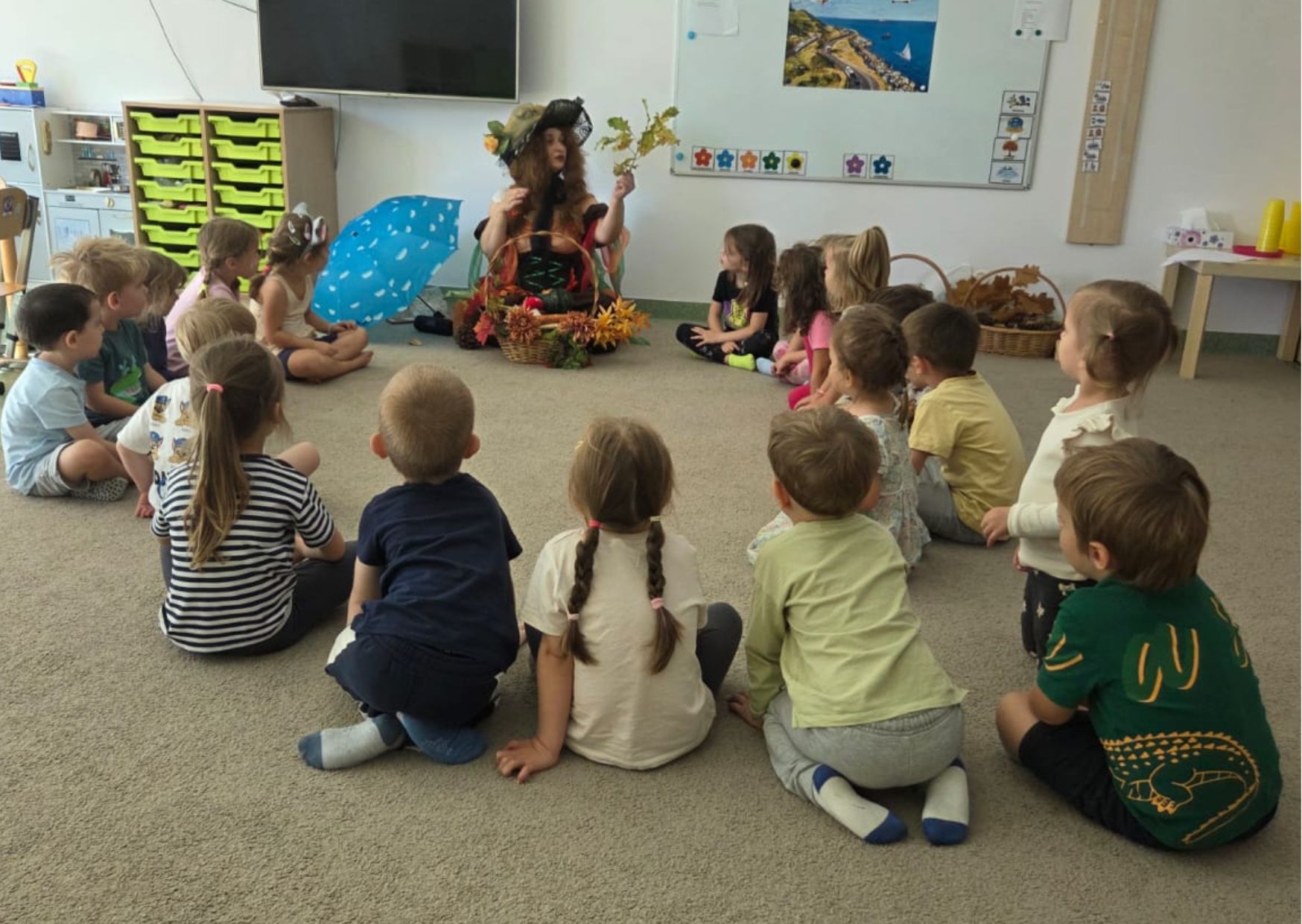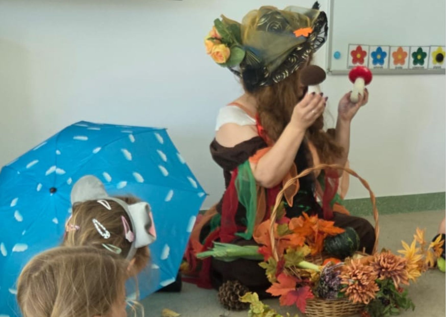 W dniu 22.09.2025 r. w „Krainie Radości” obchodziliśmy Dzień Przedszkolaka oraz powitaliśmy Jesień. Z tej okazji każdą z grup odwiedziła Pani Jesień, w swoich charakterystycznych barwach z koszem pełnym jesiennych darów. Podczas wizyty Pani Jesieni dzieci wzbogaciły swoje wiadomości o tej kolorowej porze roku i o niespodziankach jakie jesień nam przynosi. Pani Jesień rozmawiała z dziećmi i cechach pogody jesiennej oraz bawiła się z dziećmi przy wesołej piosence o spadających liściach, kasztanach i żołędziach. Każde z dzieci otrzymało medal przedszkolaka w kolorowych jesiennych barwach oraz balonik. Dzień w przedszkolu upłynął dzieciom w radosnym pełnym zabaw nastroju.