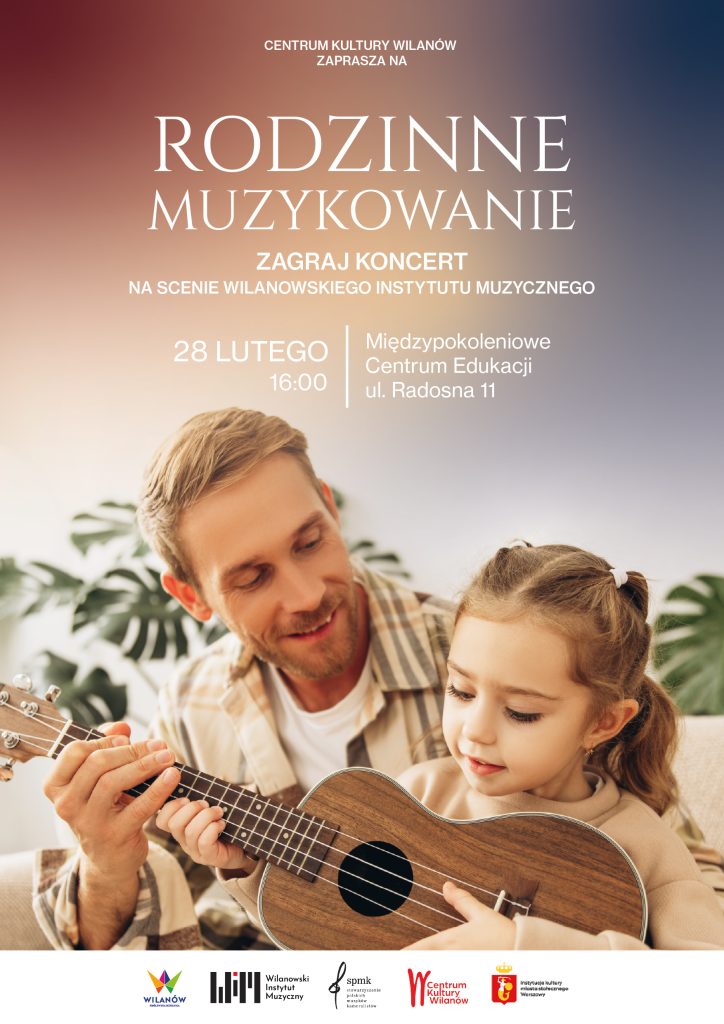 28 lutego 2026 r. (sobota) o godzinie 16.00 odbędzie się koncert "Rodzinne muzykowanie" organizowane przez Wilanowski Instytut Muzyczny w Międzypokoleniowym Centrum Edukacji przy ul. Radosnej 11.