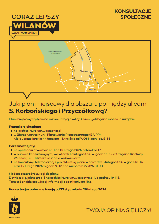 - Punkt konsultacyjny: 17 lutego 2026 (wtorek) w godzinach 16.00-19.00 - Urząd Dzielnicy Wilanów ul. F. Klimczaka 2, sala widowiskowa.