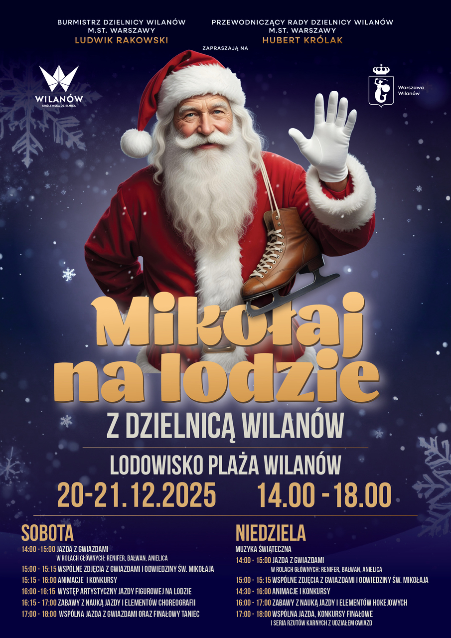 W weekend 20-21 grudnia w godzinach 14.00 -18.00 lodowisko na Plaży Wilanów stanie się miejscem spotkania ze świątecznymi postaciami oraz Mikołajem. W ramach wydarzenia "Mikołaj na lodzie" odbędzie się jazda z występującymi na lodzie postaciami, spotkanie i zdjęcia ze Świętym Mikołajem, animacje, konkursy i pokaz jazdy figurowej.