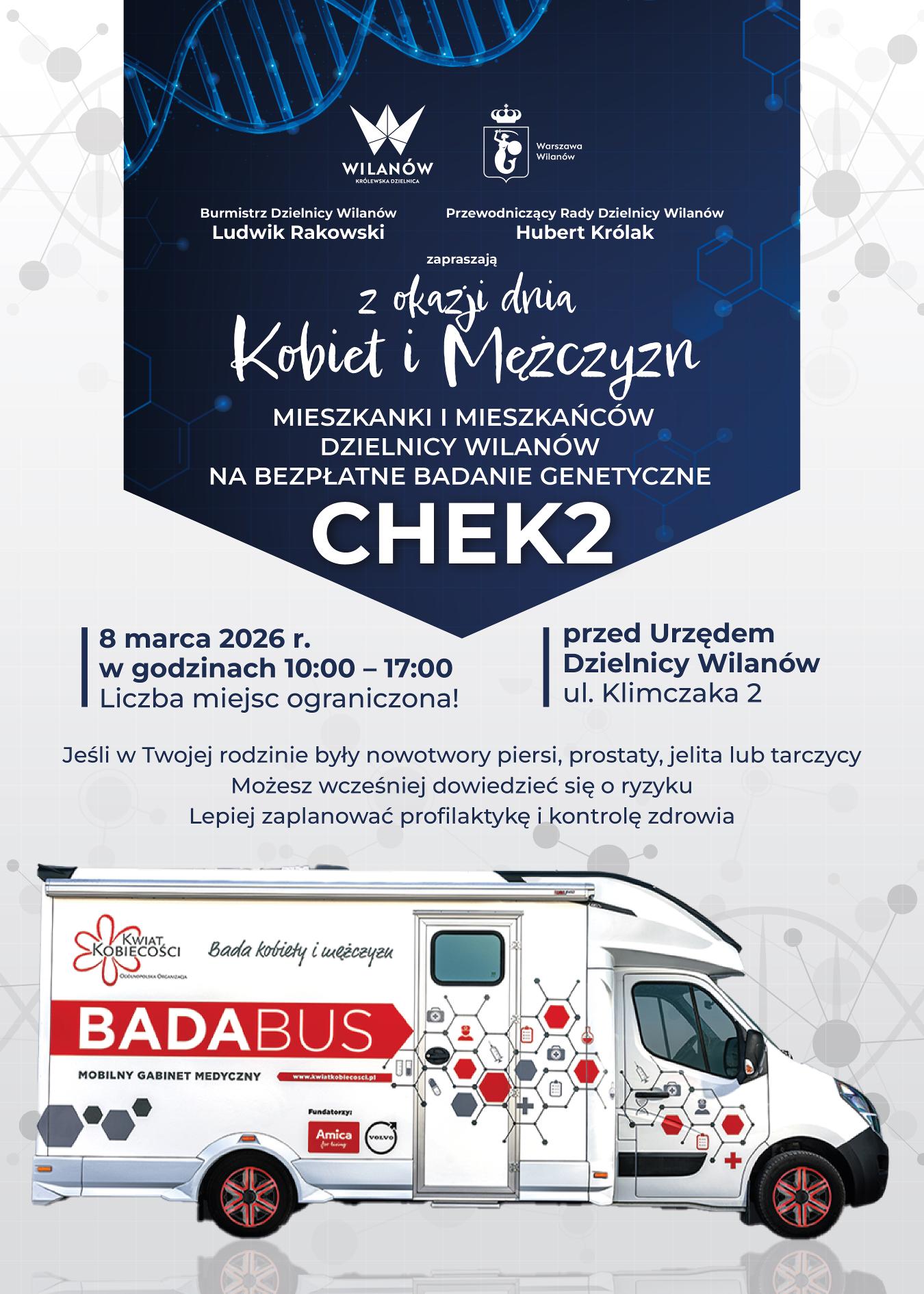 Badanie odbędzie się 8 marca 2026 r. w godzinach od 10.00 do 17.00 przed Urzędem Dzielnicy Wilanów przy ul. Klimczaka 2. Liczba miejsc jest ograniczona. Z badania szczególnie skorzystają osoby, w których rodzinach występowały nowotwory piersi, prostaty, jelita lub tarczycy - wynik może pomów wcześniej ocenić ryzyko i lepiej zaplanować profilaktykę oraz kontrolę zdrowia. CHEK2 to gen związany z kontrolą cyklu komórkowego i naprawą DNA, jego niektóre zmiany mogą wiązać się ze zwiększonym ryzykiem zachowania m.in. na nowotwory piersi, prostat, jelita grubego czy tarczycy. BadaBus to mobilna inicjatywa profilaktyczna realizowana przez Ogólnopolską Organizację Kwiat Kobiecości, umożliwiająca wykonywanie badań w formule "blisko mieszkańców".