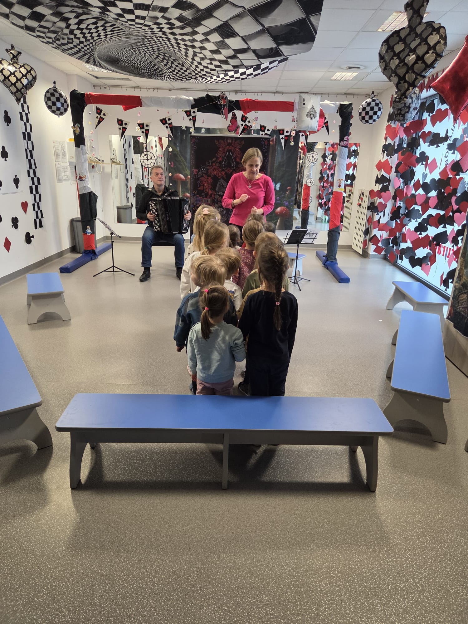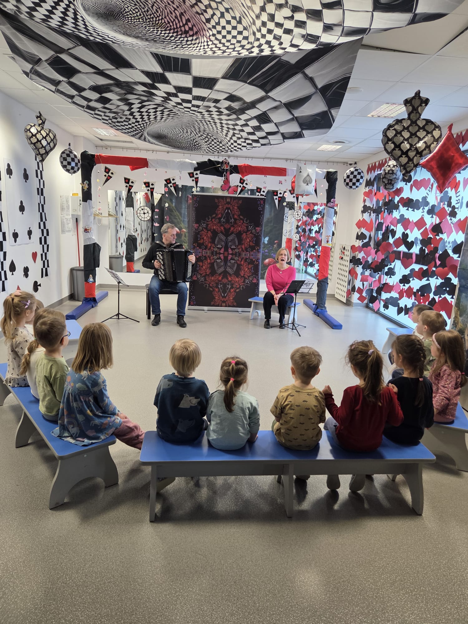 W ostatnich dniach nasze przedszkole zamieniło się w prawdziwą scenę teatralno-muzyczną. Dzieci miały okazję uczestniczyć w dwóch wyjątkowych, interaktywnych spektaklach, które połączyły literaturę, muzykę na żywo oraz twórczą zabawę.29 stycznia najmłodsze przedszkolaki (grupy 3-latków) obejrzały adaptację opowiadania Astrid Lindgren „Nils Paluszek” z oprawą muzyczną na fagocie. To ciepła, pełna humoru historia o spotkaniu chłopca z maleńkim kolegą, w której codzienne czynności zamieniają się w niezwykłe przygody. Miękkie, nastrojowe brzmienie fagotu stworzyło przytulną, domową atmosferę, a dzieci z ogromnym zaciekawieniem słuchały opowieści i aktywnie włączały się w jej przebieg – śpiewały, naśladowały odgłosy, uczestniczyły w zabawach rytmicznych i ruchowych, a także odgrywały scenki z historii. Było dużo radości, śmiechu i wspólnego działania. 30 stycznia starsze grupy (4-, 5- i 6-latki) przeniosły się do stolicy Francji podczas spektaklu „Madeline w Paryżu” na podstawie opowiadań Ludwiga Bemelmansa, z muzyką francuską wykonywaną na akordeonie. Wierszowana, pogodna historia o przygodach odważnej Madelaine i jej koleżanek wypełniona była tańcem, śpiewem oraz dźwiękami walczyków i polek. Dzieci współtworzyły fabułę - wcielały się w bohaterów, maszerowały ulicami Paryża, fruwały jak gołębie i z entuzjazmem reagowały na muzykę. Zaangażowanie, spontaniczność i wyobraźnia przedszkolaków sprawiły, że przedstawienie stało się prawdziwą wspólną przygodą. Były to fantastyczne, pełne emocji i uśmiechu spotkania z teatrem i muzyką, które rozbudziły dziecięcą ciekawość świata, rozwijały wyobraźnię oraz zachęcały do aktywnego uczestnictwa w kulturze.