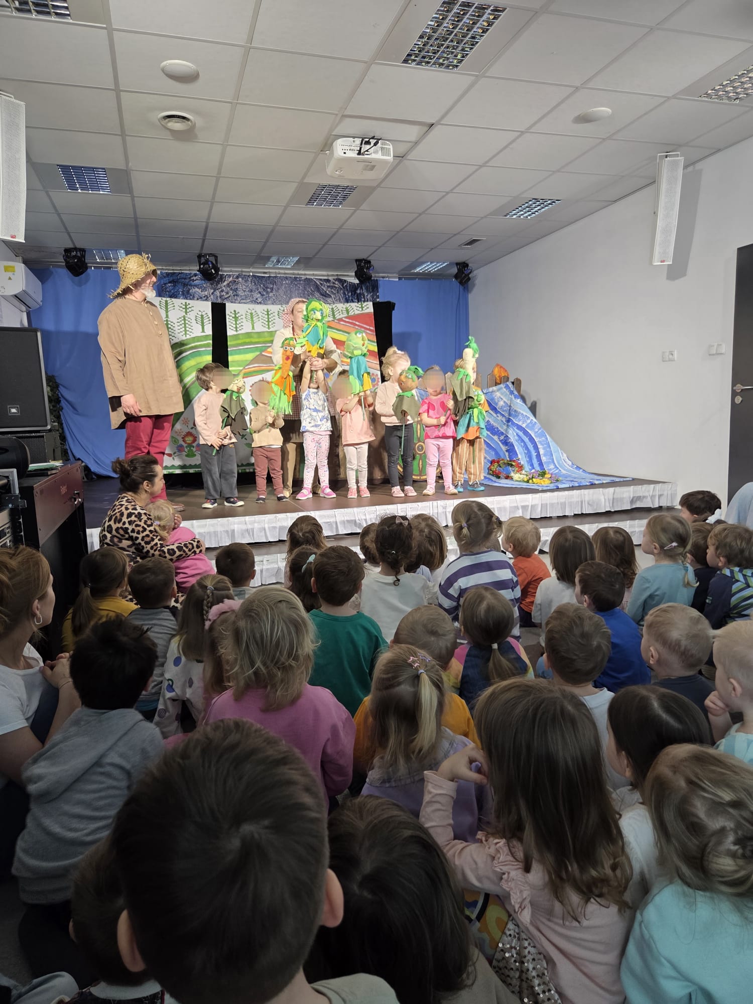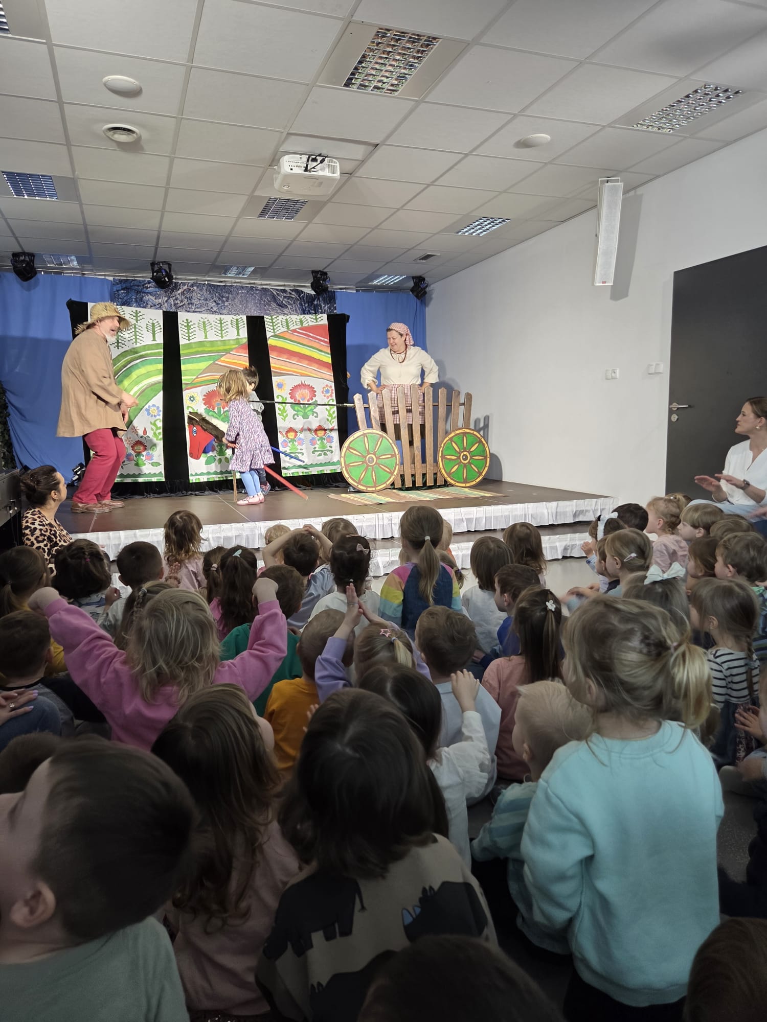 W dniu 20. 03.2026 r. dzieci z „Krainy Radości” odwiedził teatr ze spektaklem „Kukułka z wiejskiego podwórka.” Przedstawienie prowadził pan Hilary profesor wyobraźni. Dzieci wyruszają z prowadzącym do Kukiełkowa wypowiadając magiczne zaklęcie: „Niech wyrośnie co potrzeba lasy, kwiaty, pola, drzewa”. Spotykamy p. Anię z kukiełką Anią i maszerujemy w miejscu przy dźwiękach piosenki wiosennej. W krainie kukiełek dzieci spotkały Marzannę. Wszystkie dzieci zbierają z siebie swoje smuteczki i kłopoty i wrzucają je do rzeki. Pojawia się wiosna i dzieci idą na pole, aby wysiewać warzywa. Po wiośnie zaczyna się lato w noc św. Jana i dziewczynki zaplatają wianki i wrzucają je do płynącej rzeki, a kukiełki Jaś i Kasia tańczą razem. Latem na grządkach zaczynają wyrastać posiane warzywa. Na polu pojawia się strach na wróble, który pilnuje plonów. Po lecie nadchodzi jesień, a na cenę zapraszane są dzieci z kukiełkami warzyw. Jesienią obchodzone jest święto plonów – dożynki. Po jesieni nadchodzi zima i jest to czas, w którym ziemia odpoczywa w oczekiwaniu na przyszłą wiosnę. Podczas całego przedstawienia rozbrzmiewała muzyka ludowa oraz ludowe przyśpiewki. Dzieciom przedstawienie sprawiło wiele radości i pozwoliło utrwalić im kolejność następowania po sobie pór roku z ich cechami charakterystycznymi.
