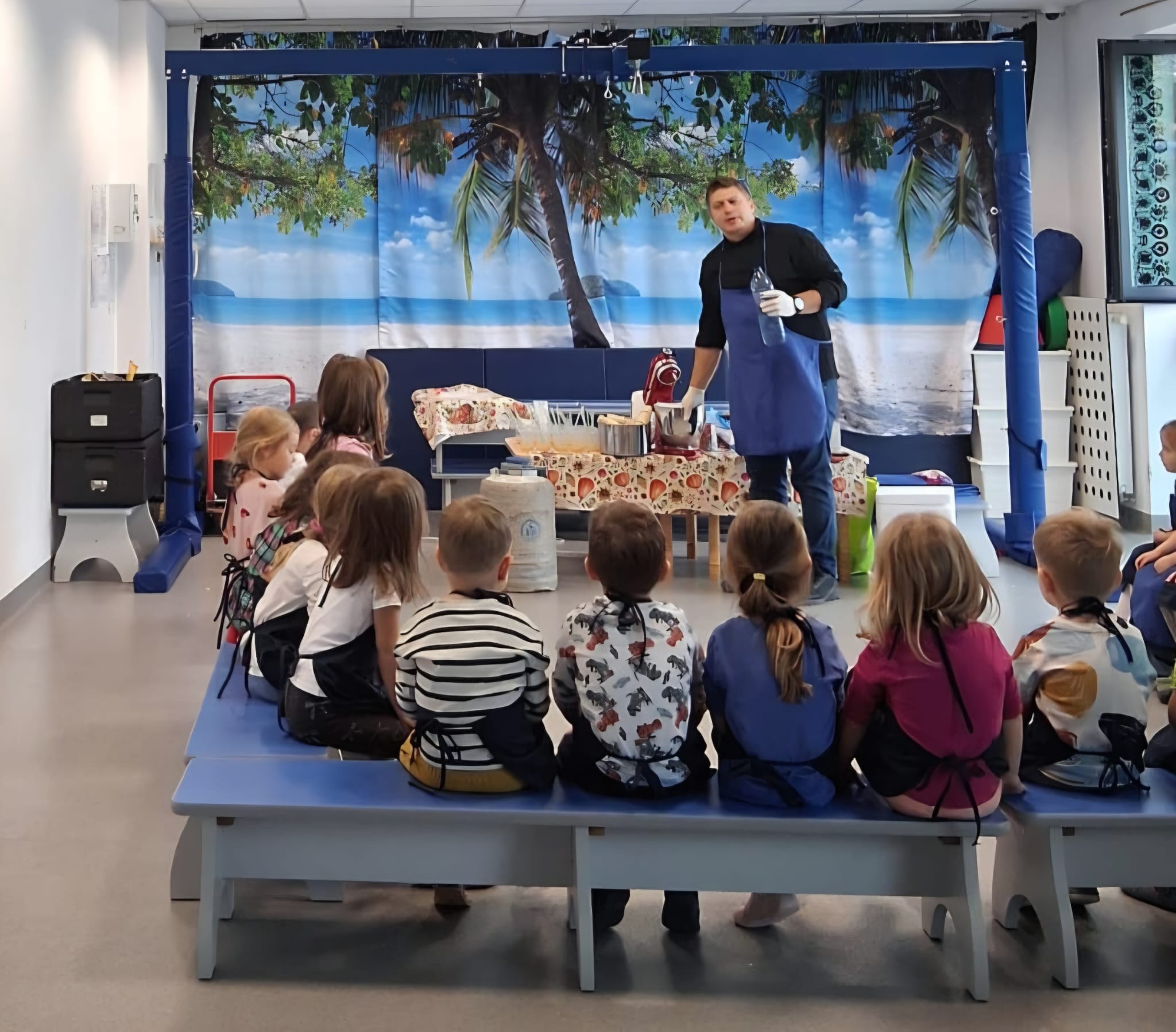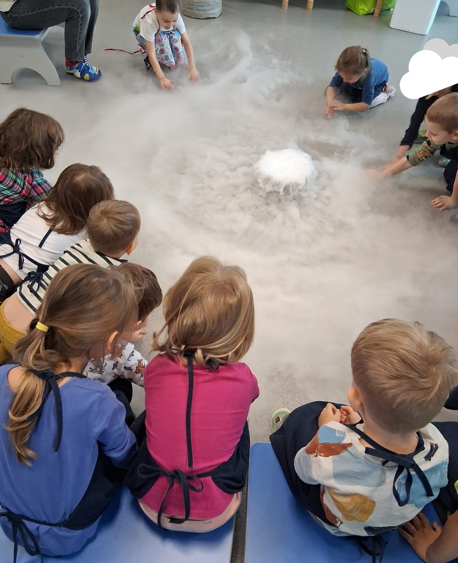 W październiku odbyły się w naszym przedszkolu warsztaty kulinarno – chemiczne dla dzieci. Kuchnia molekularna to nauka o gotowaniu, która wykorzystuje zasady chemii i fizyki do zmiany smaku, tekstury i wyglądu potraw. Podczas zajęć dzieci uczestniczyły w następujących doświadczeniach: poznanie właściwości suchego lodu i ciekłego azotu, wytwarzanie mgły, gejzer i zabawa „suchą” pianą, doświadczenie z butelka i powiększającym się balonem. W doświadczeniu „smocze chrupki” podczas ich jedzenia z nosa i buzi ulatywał dzieciom dym, a na zakończenie warsztatów wszyscy degustowali owocowe sorbety farbujące języki. Zajęcia bardzo się dzieciom podobały i wywołały salwy śmiechu i zachwytu.